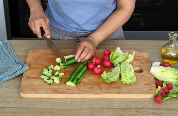 2Epluchez le concombre et coupez-le en dés. Coupez les radis en dés et les coeurs de laitue en lamelles.