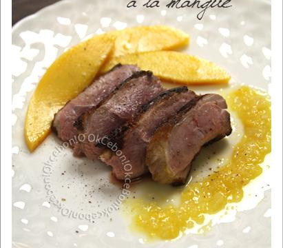 Peler et émincer très finement l'échalote. Peler les mangues et mixer la moitié d'une mangue, réserver. Dans la poêle, faire fondre l'échalote à feu doux avec le beurre jusqu'à ce qu'elle soit translucide, puis verser le vin blanc, le bouillon, la mangue mixée et le sucre. Mélanger et laisser mijoter à petits bouillon pendant environ 20 minutes. Couper le reste des mangues en tranches et réserver. Inciser le côté peau des magrets en traçant des croisillons, saler et poivrer les deux faces des magrets.