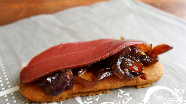 Répartir la compotée d'oignons sur les spéculoos et déposer dessus une fine tranche de magret de canard délestée de son gras (Je conseille de la couper en deux pour plus de facilités à la dégustation). Réaliser cette deuxième étape le plus tard possible afin que les spéculoos restent craquants.