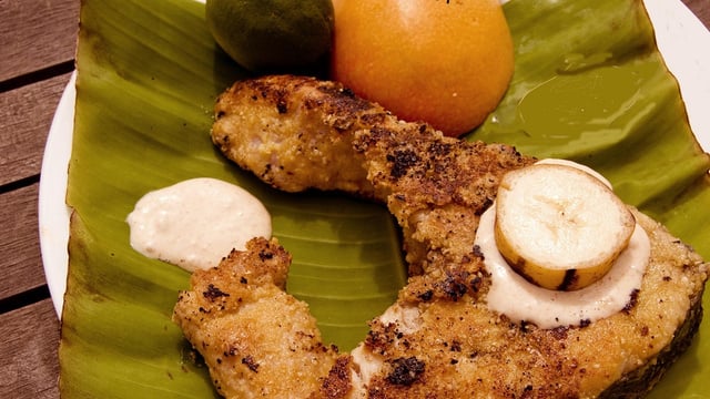 Du poisson pané et une sauce mayonnaise, curry et banane.