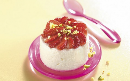 Prélever trois quenelles de maingaux et les dresser sur assiette. (ou une faisselle démoulée de l'étamine. Tailler les fraises, et les disposer harmonieusement sur chaque part de maingaux. enduire les morceaux de sirop parfumé, à l'aide d'un pinceau.