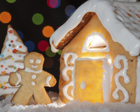 Montez la maison, collez avec le glaçage réservé et décorez le toit et les murs avec le glaçage de la poche à douille. Décorez les bonshommes : faites des yeux, un nez, une bouche et des boutons sur le haut du corps.