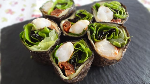 Répartir sur la feuille d'algue, en bandes successives : les courgettes taillées en fines tranches avec un économe (sur les trois quart de la surface de l'algue), les crevettes (trois par rouleau), les tomates séchées (taillées en fines bandes), quelques feuilles de roquettes et de salade et un trait le mayonnaise.