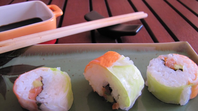 Il s'agit d'un maki classique ... mais revisité. Il est monté à l'envers en quelque sorte, puisque que le surimi est à l'extérieur, et la feuille de nori, à l'intérieur. Un maki coloré qui saura surprendre vos invités !