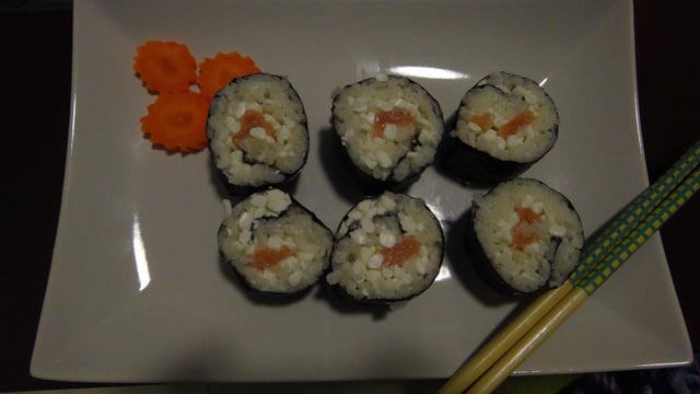 Prendre une feuille de Nori (algue). La poser sur une natte. Étalez le riz (l'équivalent d'une pomme). que la couche de riz soit la plus fine possible (pensez à vous mouiller les mains pour éviter que le riz colle. Et déposez un très fin films (même pas 1 gramme) de Wasabi ATTENTION c'est très fort.