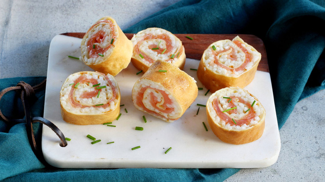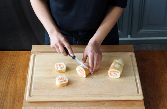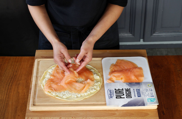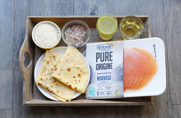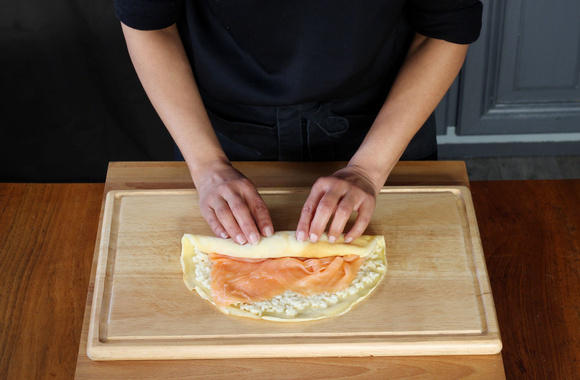 7Roulez la crêpe en serrant un peu, filmez le boudin de crêpe à l'aide d'un film alimentaire. Répétez l'opération avec les 3 crêpes restantes, afin d'obtenir en tout 4 boudins de crêpes au risotto et saumon fumé. Laissez reposer 15 minutes au frais.