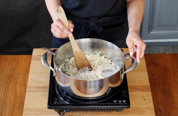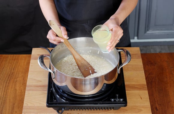 Quand les échalotes sont transparentes, ajoutez le riz, et faites-le revenir jusqu'à ce qu'il devienne translucide. Déglacez avec le vin blanc. Remuez le tout.