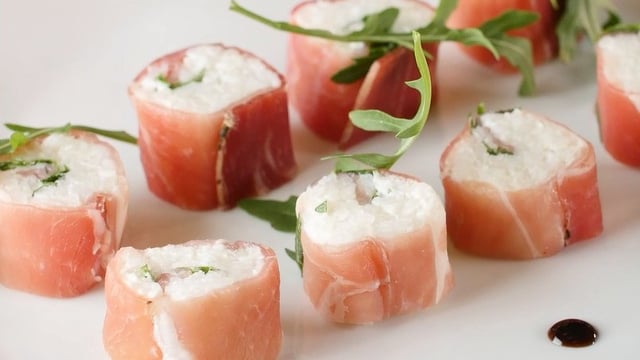 Dérouler les nattes à makis et disposer les tranches de jambon de Parme. Etaler le riz sur les tranches et ajouter quelques feuilles de roquette. Rouler et envelopper la préparation, la mettre dans un film alimentaire. Réserver 20 minutes au frais.
