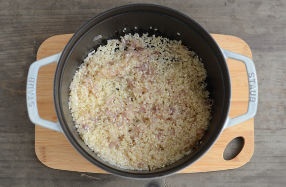 Quand les échalotes sont transparentes, ajoutez le riz, et faites-le revenir jusqu'à ce qu'il devienne translucide.