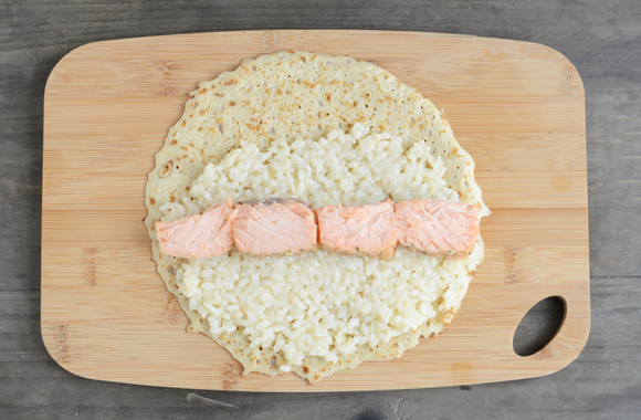 Etalez le risotto sur chaque crêpe, disposez les tranches de saumon au milieu et en longueur.