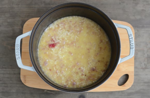 Une fois que le vin blanc s'est presque évaporé, ajoutez une louche de bouillon de légumes tout en remuant pour que le riz ne s'accroche pas au fond de la casserole. Salez et poivrez.