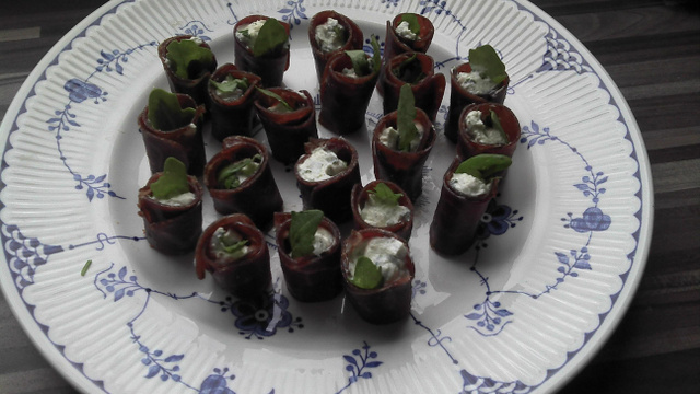 Découper les tranches de viande des Grisons en 2 dans le sens de la longueur (sinon les rouleaux sont trop longs et sont pénibles à manger lors de l'apéritif).
