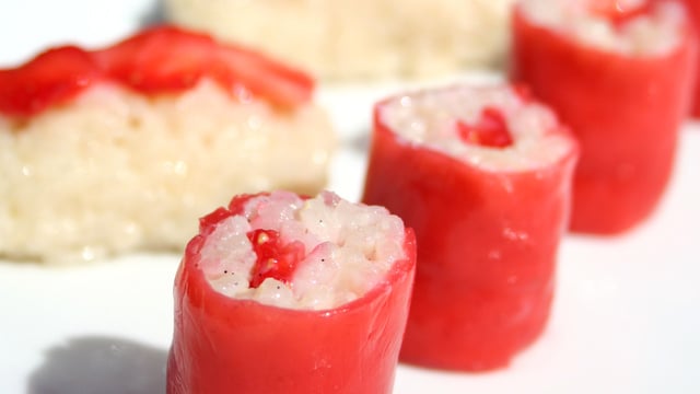 Décollez vos feuilles de fraise gélifiées, garnissez de riz sur 3 cms, ajoutez des morceaux de fraises, puis roulez vos makis.