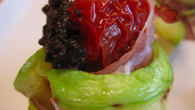 Il s'agit d'une tranche de courgette qui enrobe du jambon de pays et une tranche de tomate séchée, le tout avec une touche de tapenade. On peut servir ce plat en entrée ou à l'apéritif. C'est aussi bon que beau.
