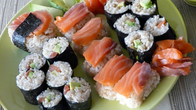 Soulever le bord de la natte et former le maki en roulant le tout. Rabattre le reste de la natte sur le rouleau et serrer. Retirer le rouleau de la natte. Laisser la feuille de nori s'imprégner du riz à sushis quelques minutes.