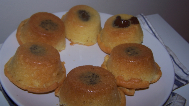 'Planter' un carré de chocolat au milieu de la pâte pour chaque moules puis recouvrir avec le reste de la pâte.