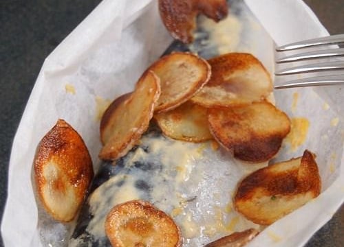 Quand elle est bien chaude, y faire revenir les lamelles de pomme de terre, bien à plat, les retourner quand elles sont bien dorées, puis les disposer sur un papier absorbant. Les saupoudrer de fleur de sel et de poivre.