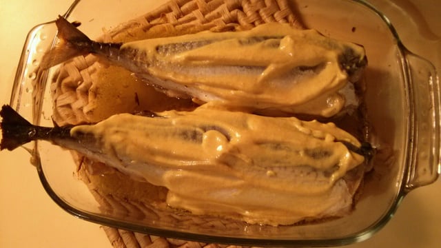 De beaux maquereaux brillants, à l'oeil vif, péchés de la veille, généreusement badigeonnés de moutarde forte de Dijon puis passés au grill.