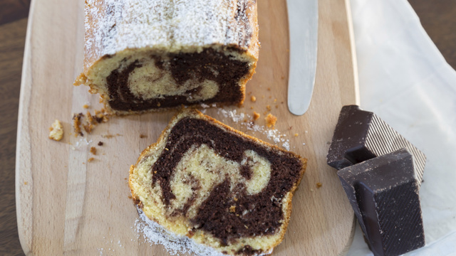 Versez la pâte dans un moule à cake en alternant la pâte vanille et la pâte chocolat. Enfournez 45 minutes.