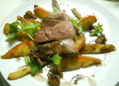- 4DressageRépartir la salade chaude dans les assiettes.Ajouter de la roquette.Détailler le marcassin en tranches et les disposer sur la salade.