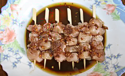 Enfiler les morceaux de poulet sur 6 brochettes .