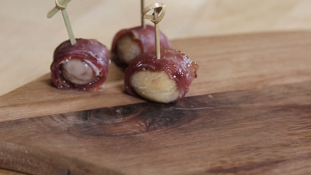 Entourez chaque marron d'une lanière de jambon, ajoutez une pointe de confit de figues et piquez avec un mini-pique en bois.