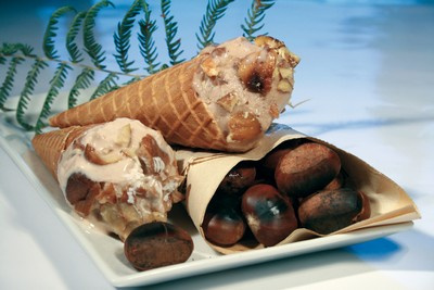 Dans un cornet à glace, déposer la demi-boule de nougat glacé à la châtaigne.