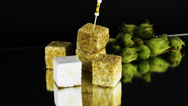 Le lendemain, démouler et couper à l'aide d'un couteau dont la lame sera trempée dans de l'eau chaude des lanières et ensuite des cubes. Les rouler dans la poudre de noisettes.
