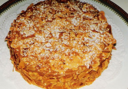 Un entremets léger réunissant - meringue - génoise - crème pralinée - et amandes parfumées à la fleur d'oranger.