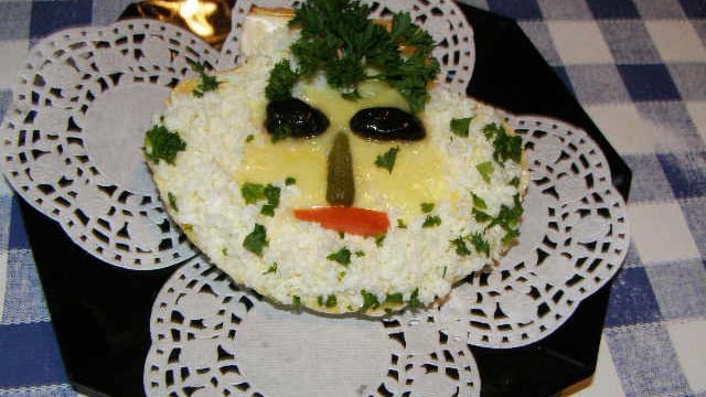 Pour donner vie aux masques de surimi on dispose un petit bouquet de persil en haut de la coquille,une olive coupée en deux pour représenter les yeux, 1/4 de cornichon pour le nez et deux petits bouts de tomate pour la bouche.