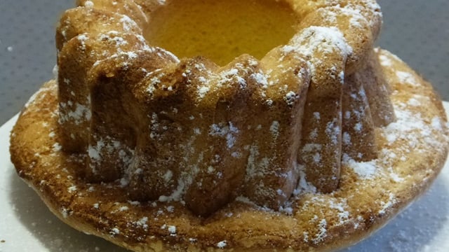Verser la préparation dans le moule. Saupoudrer le dessus de sucre cristallisé. Cuire à 160 °/170 °C pendant 45 min. Laisser tiédir 15 min. Retourner le gâteau sur un plat et saupoudrer de sucre glace!!! Régalez-vous!!!
