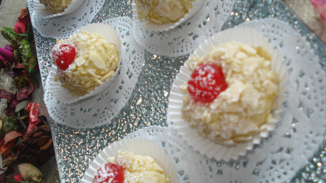 Ajouter l'oeuf et le jaune d'oeuf pour obtenir une pâte molle. Mais pas collante formez des boules de 25g a 30g chacune. Plonger les boules d'amandes dans le blanc d'oeuf et enrober d'amande effilées et orner d'une demi-cerise confite enfournez pour 12 à 15 min.