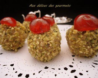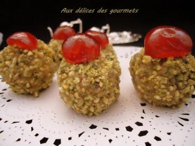 Ajouter le miel et bien mélanger. Façonner des boules ensuite les badigeonner de miel. Enrober ces boules de pistaches concassés finement. Décorer avec une demie cerise.