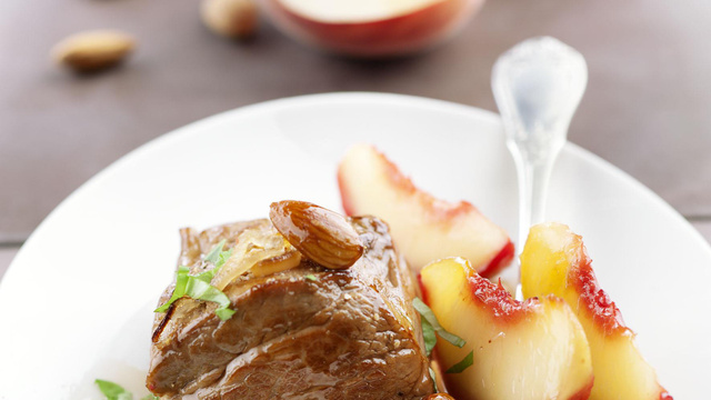 Ajouter les pêches, les amandes et 1 cuillère à soupe de vinaigre de Xérès. Faire revenir à feu vif pendant 5 minutes pour caraméliser les pêches.