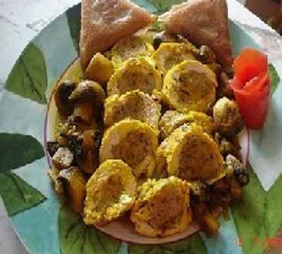 Couper le ballot en médaillons et dresser dans l'assiette avec le riz et la sauce.