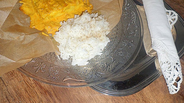 Faire chauffer une crêpière à feu moyen pour faire brunir les papillotes quelques minutes de chaque côté. Déposer une papillote dans chaque assiette (laisser les convives l'ouvrir eux-mêmes) et déguster avec du riz.