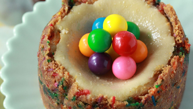 Préchauffer le four à 150°C. Dans la cuve du robot, battre le fromage Philadelphia avec le sucre. Ajouter l’arôme artificiel de chewing-gum et la crème sure tout en continuant à battre. Ajouter les œufs 1 à 1 en s’assurant que la préparation est bien homogène. À l’aide d’une Maryse, ajouter la farine. Incorporer le lait en 3 fois. Enfin ajouter les bonbons multicolores à la spatule sans trop remuer afin de ne pas les dissoudre dans la pâte. Verser cette préparation sur la croûte du gâteau fromage. Enfourner pour 40 minutes en vérifiant la cuisson à l’aide d’un cure-dent. Le cure-dent doit ressortir sec ou à peine humide. Dès la sortie du four, réserver