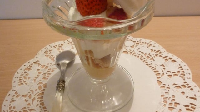 1 portion individuelle de Mont-Blanc pêche-abricot (ou, à défaut, vanille)