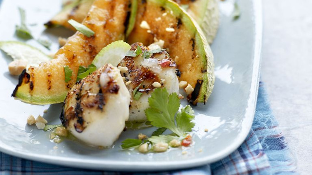 Coupez le melon de Guadeloupe IGP en 4. Atez les graines et coupez chaque quart en fines lamelles. Chauffez votre grill ou votre plancha. Faites griller vos noix de Saint Jacques et vos tranches de melon de Guadeloupe IGP 1 minute de chaque côté.