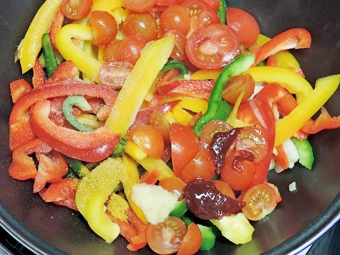 1Préparer les légumes : Émincer l'oignon et l'ail, laver les tomates et les couper en 2, laver les poivrons, enlever les pépins et les couper en fines lanières. Dans un wok, avec un peu de graisse, faire revenir l'oignon et l'ail, 1min à feu moyen. Ajouter les poivrons, les tomates, la pâte de piment, le gingembre, le ras-el-hanout, le sel et mélanger.