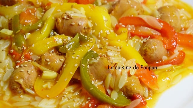 Un repas pour le soir, facile à préparer dans un wok servi avec des pâtes grecques.