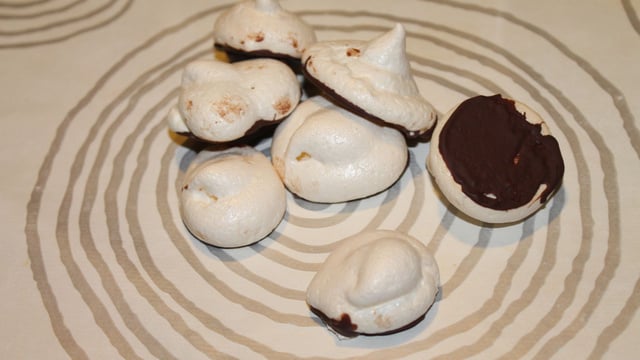environ 40 petites meringues parfumées à la mandarine et nappées de chocolat noir, un délice !
