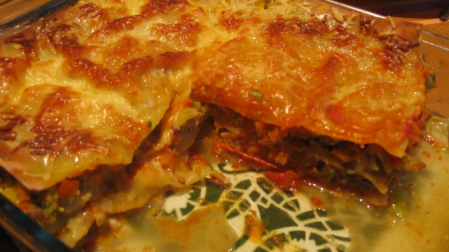 Recommencer l'opération: lasagnes + légumes + sauce tomate + crème + fromage. Terminer par une couche de lasagnes et du gruyère.