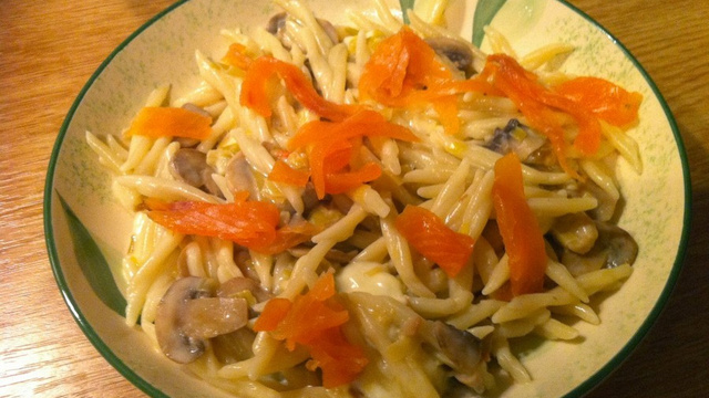 En cherchant un paquet de lasagnes, j'ai découvert une variété de pâtes que je ne connaissais pas : Les trophies. J'en ai immédiatement acheté un paquet. Que faire avec ? J'ai regardé dans mon frigo et c'est tout simplement comme cela qu'est née cette divine recette. Je dis divine car elle le mérite ! Les amateurs de pâtes ne peuvent qu'ADORER !