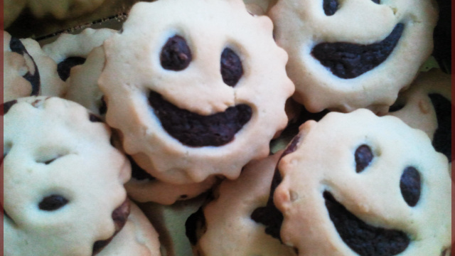 Au centre des petits cercles pleins, déposez une cuillère à café de ganache au chocolat, et déposez par dessus un disque smile.