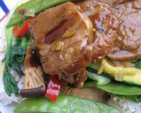 dressage : sur chaque assiette, placer 3 boulettes de riz (ou bien le riz tel quel), les légumes coiffés de deux ou trois tranches de mignon de porc.