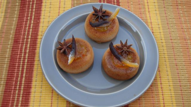 - Pour le confit de clémentines :Faites trempez les feuilles de gélatine dans un bol d'eau froide. Épluchez à vif les clémentines, récupérez les segments et le jus dans une casserole. Ajoutez une cuillère de cassonade, la gousse de vanille fendue en 2 et grattée, et les étoiles de badiane. Mettez à cuire sur feu vif, pendant environ 10mn. Lorsque les clémentines sont en compote, baissez le feu, et laissez réduire encore 5mn. Stoppez la cuisson, ajoutez les feuilles de gélatine égouttées, mélangez et laissez refroidir. Retirez la gousse et les étoiles.Pour les savarins :Préchauffez votre four à 180°C (th.6). Dans une casserole, faites chauffer le lait avec le miel. Dans un saladier, mélangez la farine avec la cassonade, les épices et le zeste d'une orange. Versez dessus peu à peu le lait chaud en mélangeant bien. Ajoutez le jus d'une orange (ou la moitié si la pâte vous semble trop liquide). Répartissez la pâte dans un moule en silicone à empreintes de minis savarins. Faites cuire au four environ 15mn, en surveillant la cuisson. A la sortie du four, versez sur les savarins le jus de 2 oranges pressées chaud, et laissez s'imbiber. Démoulez sur grille.Présentation et décoration des minis savarins :Coupez votre écorce d'orange en petites lamelles. Faites fondre au micro-ondes quelques morceaux de chocolat noir, ajoutez une goutte d'huile afin de le rendre brillant. Trempez les écorces dans le chocolat fondu jusqu'à la moitié, et laissez durcir sur du papier sulfurisé. Posez les minis savarins dans des petites soucoupes en porcelaine. Remplissez le creux avec le confit de clémentine. Posez sur le dessus une petite orangette maison ainsi qu'une étoile de badiane.Servez en fin de repas avec le café et dégustez !