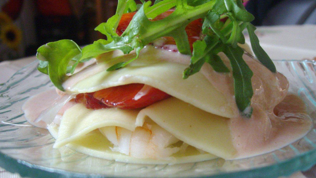 Faire cuire des crevettes à la vapeur, ainsi que des ronds de lasagnes fraîches dans de l'eau frissonnante.