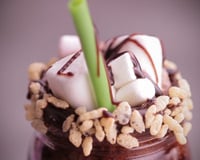 Verser le milkshake et décorer de marshmallow, de chocolat fondu et servir avec une paille.