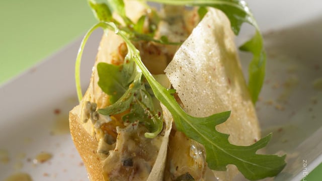 Ce millefeuille est fondant avec les légumes, croustillant avec les feuilles de brick légèrement caramélisées et crémeux grâce au Bresse Bleu.